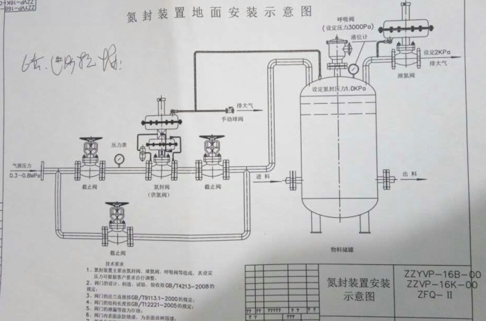 ▲ 對于應用于儲罐氮封的調壓閥取壓點應直接取自于罐頂,因為只有這樣才能充分發揮調壓閥的輸出流量來滿足氮封流量的需求,使罐頂保持相對于大氣壓的微正壓。儲罐上一般安裝呼吸閥與調壓閥配套使用,在正常使用時儲罐靠調壓閥吸氣,靠呼吸閥排氣,當調壓閥故障或氮氣中斷時,呼吸閥可吸氣以保護儲罐不致吸癟。